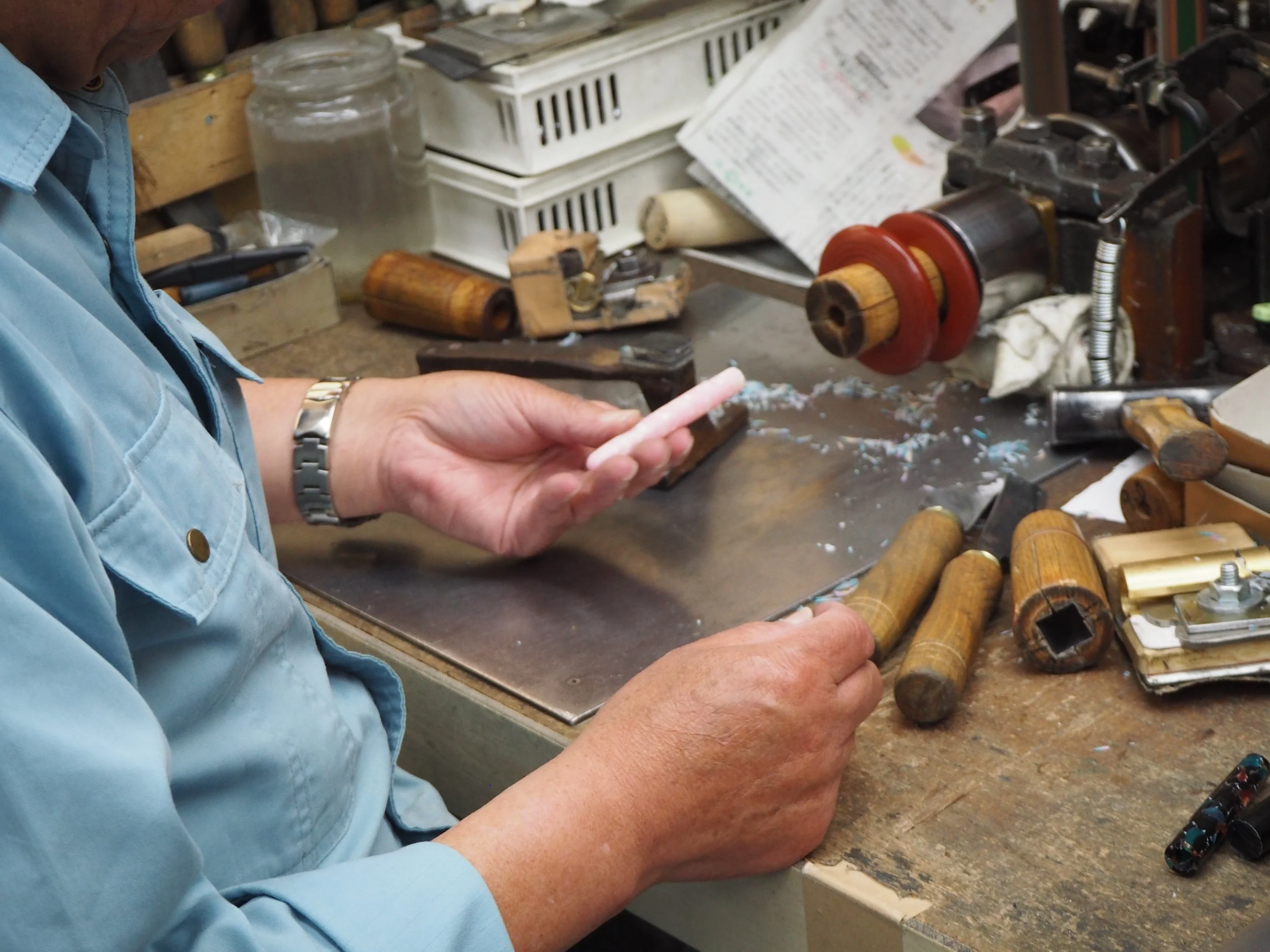 Here are the last vestiges of a once booming industry of some 500 pen makers in Osaka, producing hand-turned celluloid pens from the 1920s onwards. We feel proud to present to our customers the pens of Mr Kato and his apprentice Mr Ohnishi, who have been safekeeping this craft single-handedly for the last few decades.